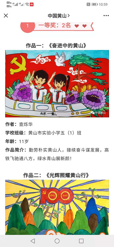 獻禮百年繪華章:5月17日,由黃山風景區黨工委宣傳部、黃山風景區黨工委黨史學習教育領導小組辦公室、黃山旅遊集團有限公司共同主辦的“童心永向黨,共繪新黃山”黨建主題繪畫徵集活動通過景區官方微信公眾號“中國黃山”正式上線。經過了10天的網友投稿及線上投票,6月1日於公眾號公佈了評選結果,來自全國中小學生的286幅徵集投稿作品中共有30幅作品獲得了一二三等獎及優秀獎等獎項。這些作品中,不乏宣揚黃山紅色文化、黃山時代變遷以及黃山的歷史人文。該項活動的成功舉辦,讓廣大少年兒童在動手實踐中,“刻畫”了革命英烈的偉大形象,“描繪”出黨走過的偉大光輝歷程,“勾勒”起愛黨愛黃山的多彩畫卷。