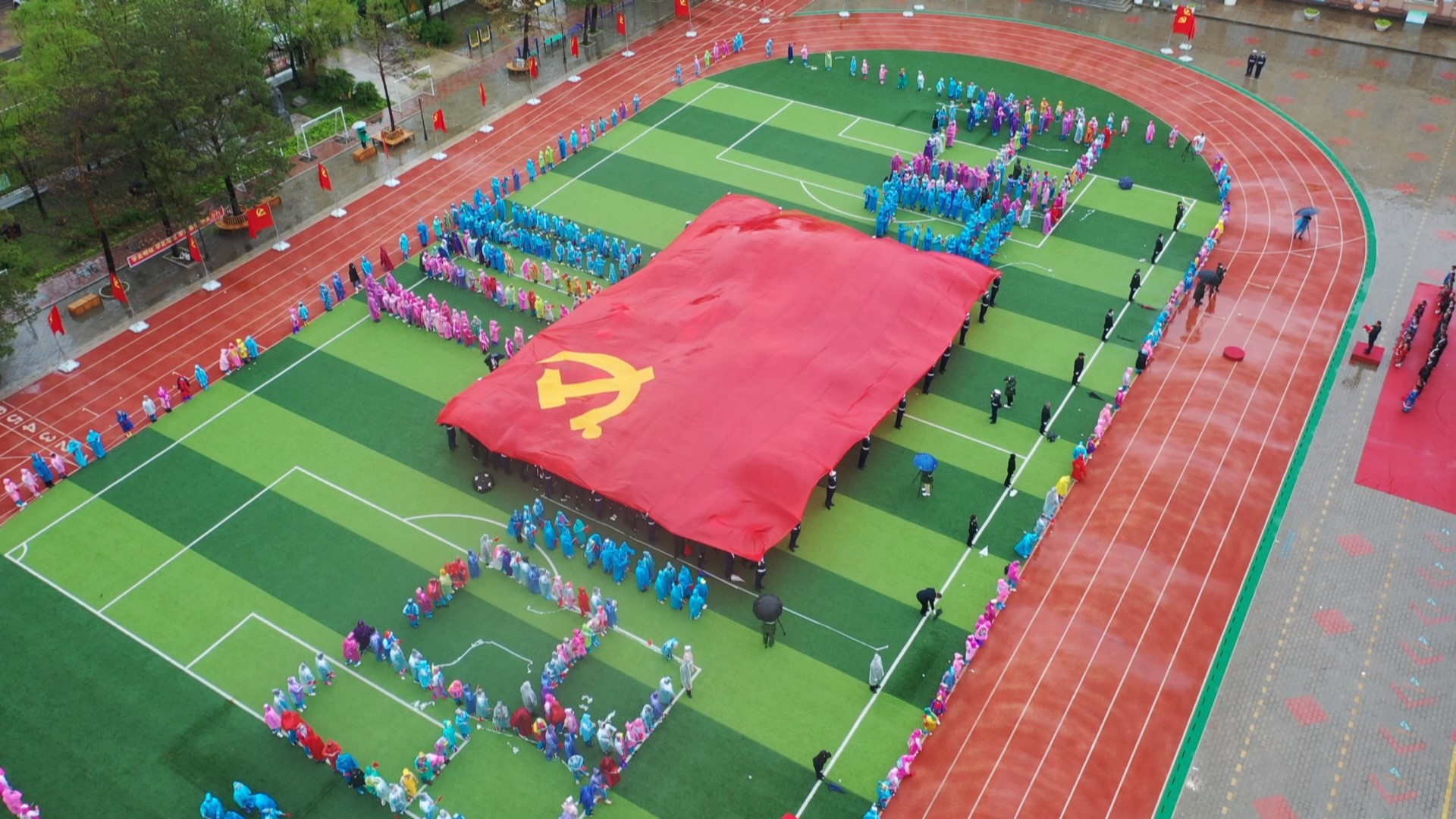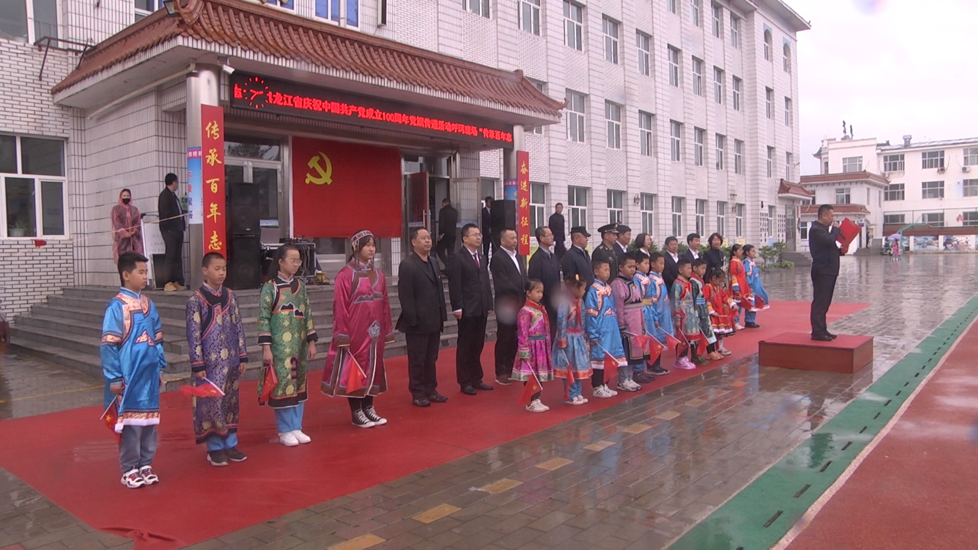 活動現場,全體人員莊嚴肅立,儘管天空下着小雨,但仍然井然有序地組成了「1921-2021」、「100」的圖案,表達了對黨的敬意。全體黨員面向黨旗,重溫入黨誓詞。大家緊握右拳,神情專注,鏗鏘有力的誓言在操場久久迴響。呼瑪縣第三小學合唱團演唱了歌曲《唱支山歌給黨聽》。縣政協主席吳軍向基層黨組織代表授旗,各黨組織代表進行黨旗接力傳遞。全體人員接力傳遞15米的巨幅黨旗,一次次的接力,讓人們又回到那烽火歲月,再次重溫誓言初心。隨後處級領導幹部和各黨組織代表分別與黨旗合影。在全體人員合唱的《沒有共產黨就沒有新中國》雄壯歌聲中,活動圓滿結束。通過重溫入黨誓詞、黨組織和全體同志分別傳遞黨旗、共唱紅歌、黨旗合影等形式,共同慶祝中國共產黨成立一百周年,深切表達了呼瑪兒女「身在最北方、心向黨中央」的熾烈情懷,展現了呼瑪黨員幹部蓬勃向上的精神風貌。