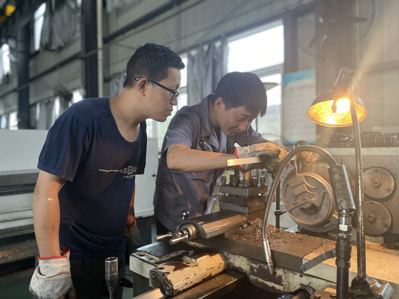 6月3日,在位於安徽黃山市屯溪區黃山九龍低碳經濟園區內的黃山拓達科技有限公司的生產車間裏,工人們正在車床上對產品進行檢測打磨。