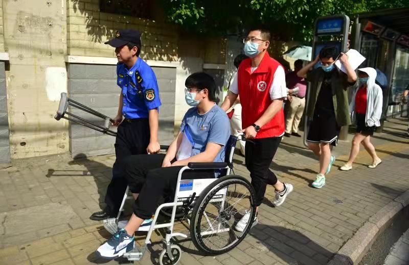 6月7日上午,合肥五十中高考考點,考生坐在輪椅上由三里庵街道竹蔭里社區志願者推進校園。該考生由於打籃球受傷骨折,蜀山區竹蔭里社區志願者了解情況後,當天一大早從小區接該考生,送到考點。並約好,一直接送直至完成考試(蜀山區委宣傳部供圖)
