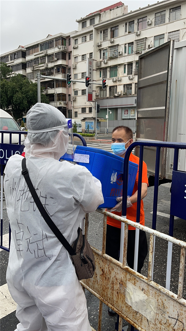 在社區服務的這幾天,梁卓斌主要承擔起了給隔離人員送餐送貨資的工作,以及協助隔離區內的核酸檢測工作。他所在的小區約有9000人,一天核酸檢測下來有時超過12小時,忙碌的時候也不覺得累,晚上回到家才感覺到腰都硬了。