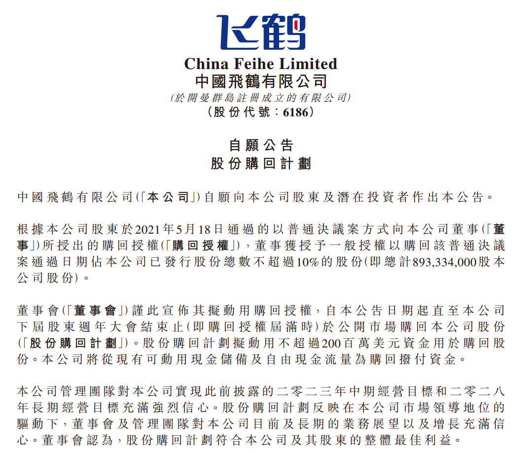 中國飛鶴發佈股權購回計劃,回購比例占公司已發行股份總數的10%。受訪者供