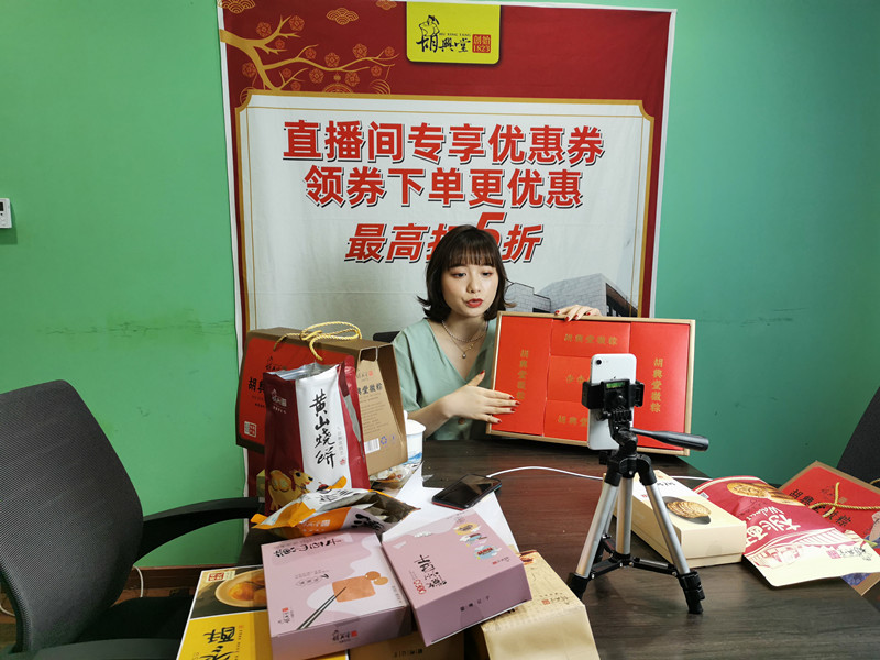 6月7日,記者在安徽省黃山市胡興堂文化發展有限公司看到,直播間內主播正在推薦眼下熱門的時令糕點,物流配送中心內工人們正忙著下單、打包、發貨,一片忙碌的景象。恰逢端午節即將來臨,該公司的粽子、鴨蛋、綠豆糕等產品線上銷售如火如荼。“我們電商成立的比較晚,但是這兩年發展比較快,今年目標大概是5000萬,目前已經完成了2000萬左右。”黃山市胡興堂文化發展有限公司總裁辦主任程登科向記者介紹,公司今年打算拓寬多種線上銷售渠道,讓產品借電商直播的春風將品牌打出去。