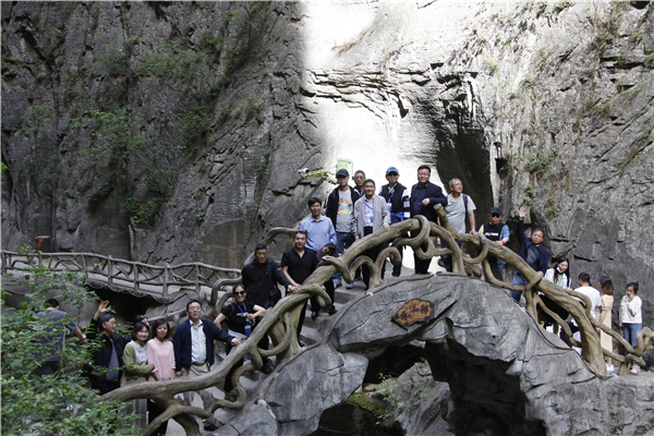 著名作家採風團 一行在山勢雄渾、峽谷幽深的通天峽合影留念