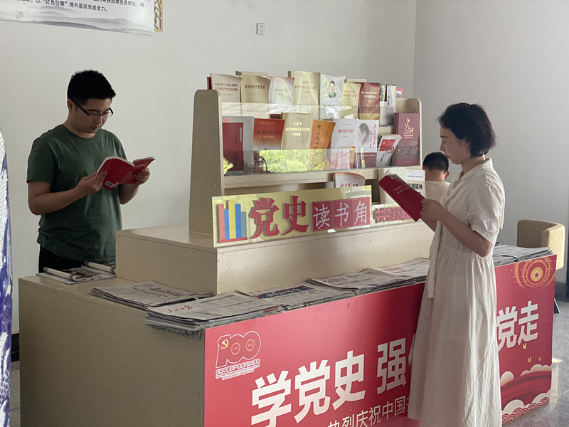 在陽湖鎮政府一樓大廳右側,新開設的“黨史讀書角”上整齊地擺放著《論中國共產黨歷史》《中國共產黨簡史》等以黨史為主題的“紅”色圖書,工作人員們利用下班空餘時間來到這裏閱讀充電。“平時只要一有空就來這裏轉一轉、看一看、充充電,通過閱讀、汲取一些精神食糧運用到自己的工作中。”來自該鎮的組工幹部黃月月說。