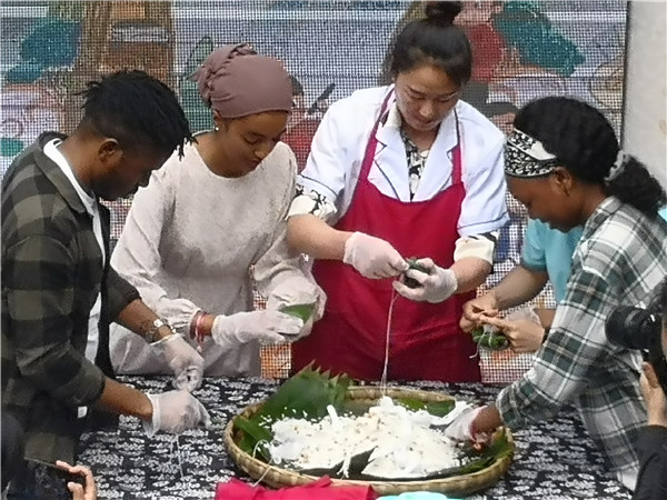 傳承非遺,感受傳統。在豐盛鎮的十全堂,糯米、粽葉、綠豆、肥五花肉等材料一字排開,在當地居民的教導下,外國友人們認真地學習起包粽子。他們拿起粽葉輓成漏斗,鋪上糯米塞入五花肉,再鋪一層糯米,粽葉一合,拿繩子捆扎,一個個結實的咸肉粽就包好了。