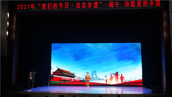 6月11日,由甘肅省文化和旅遊廳指導,中共蘭州市委宣傳部、蘭州市文明辦主辦,蘭州職業技術學院、蘭州市電影發行放映公司承辦的「2021我們的節日·活態非遺—端午·詩歌里的中國」吟誦活動在蘭州職業技術學院蘭職講堂舉行。