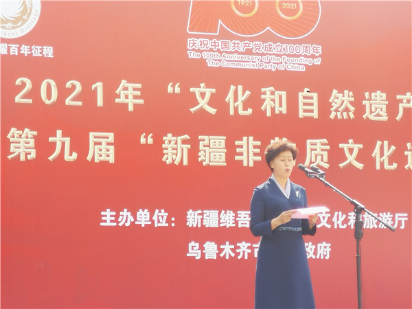 6月12日,由新疆維吾爾自治區文化和旅遊廳和烏魯木齊市人民政府共同舉辦的2021年「文化和自然遺產日」暨第九屆「新疆非物質文化遺產周」主會場活動在八路軍駐新疆辦事處紀念館開幕。自治區人民政府副秘書長高志敏宣布2021年「文化和自然遺產日」暨第九屆「新疆非物質文化遺產周」活動啟動。自治區文化和旅遊廳黨組書記、自治區文博院黨組書記侯漢敏在啟動儀式上講話,烏魯木齊市市委常委、宣傳部長隋榮在啟動儀式上致辭。自治區文化和旅遊廳黨組成員、副廳長柯尼斯·杉尼,自治區文化和旅遊廳黨組成員、副廳長張勇東等出席活動。
