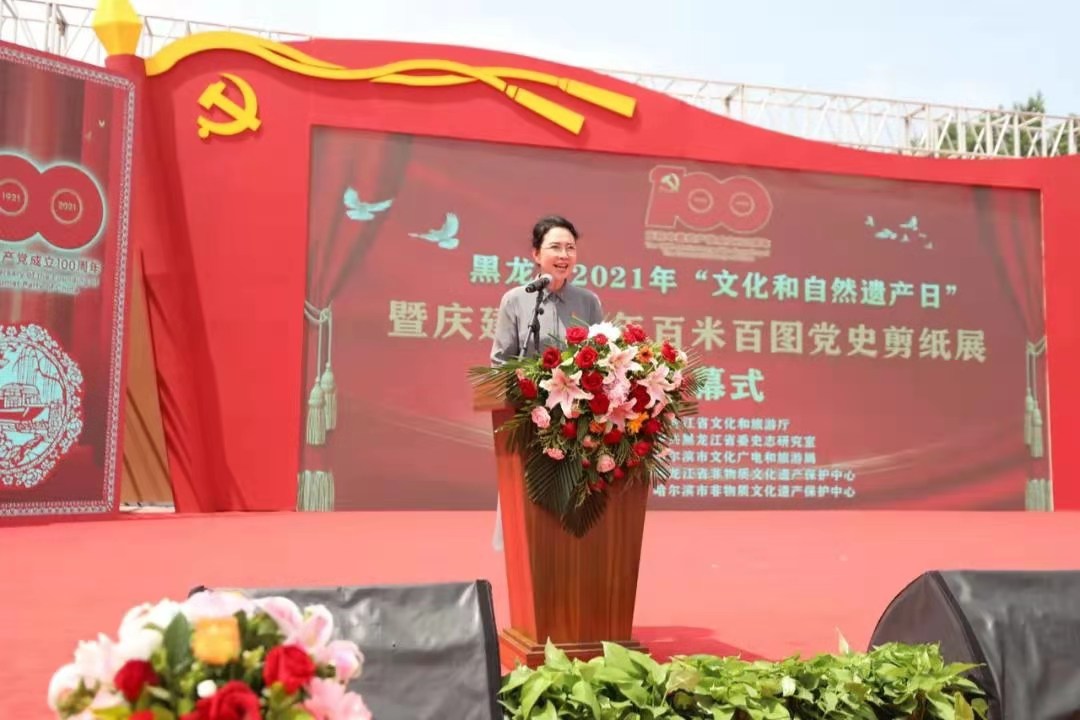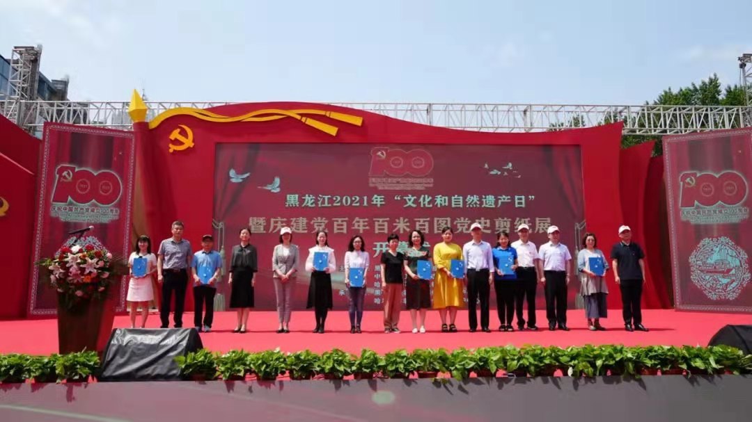 一百米長卷,一百幅剪紙,一百年奮鬥與輝煌。為慶祝中國共產黨成立100周年,由黑龍江省文化和旅遊廳、中共黑龍江省委史志研究室、哈爾濱市文化廣電和旅遊局共同主辦,黑龍江省非物質文化遺產保護中心、哈爾濱市非物質文化遺產保護中心共同承辦的「黑龍江2021年『文化和自然遺產日』暨慶建黨百年百米百圖黨史剪紙展」於6月12日在防洪紀念塔前廣場隆重啟幕。