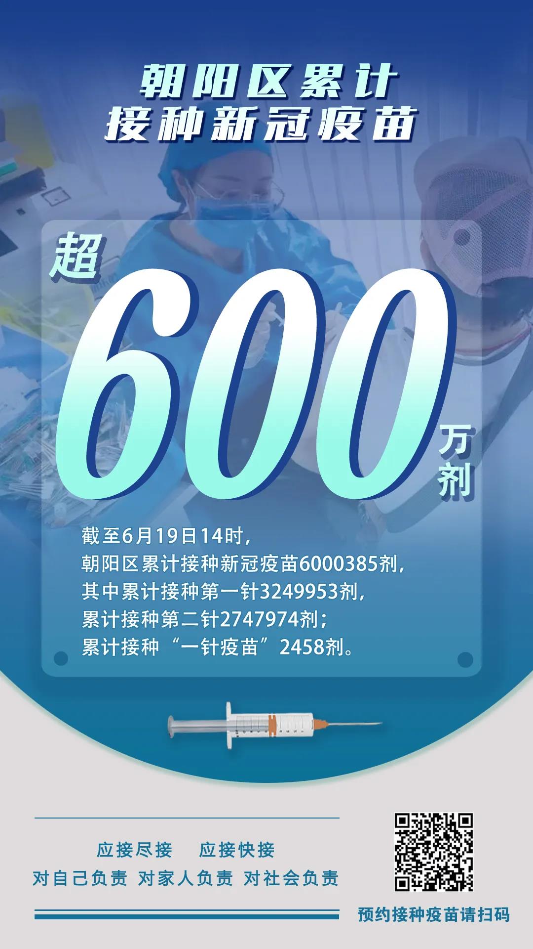 據北京市朝陽區提供的信息統計顯示,截止6月19日14时,朝陽區累計接種新冠疫苗6000385劑,其中累計接種第一針3249953劑,累計接種第二針2747974劑,累計接種「一針疫苗」2458劑。