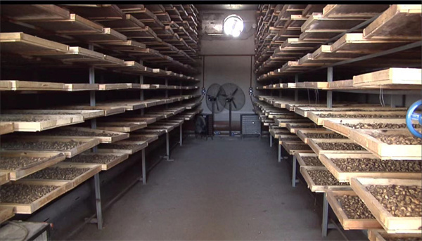 剛從地里回來的霍春林一身迷彩服,每到一處都滔滔不絕的向記者介紹着。他說,平貝烘乾方式從1984年傳統的自家火炕烘乾和庭院晾曬烘乾,後演變成土房建爐烘乾,到目前的現代化、自控化烘乾,極大的提升了產品的加工能力和品質,降低了生產成本。目前,該加工廠為全省最大的烘乾加工車間,烘乾加工流程為車間清洗-擺盤-晾曬-烘乾-挑選-入庫6道工序,車間加工產品面向全市乃至周邊縣市。