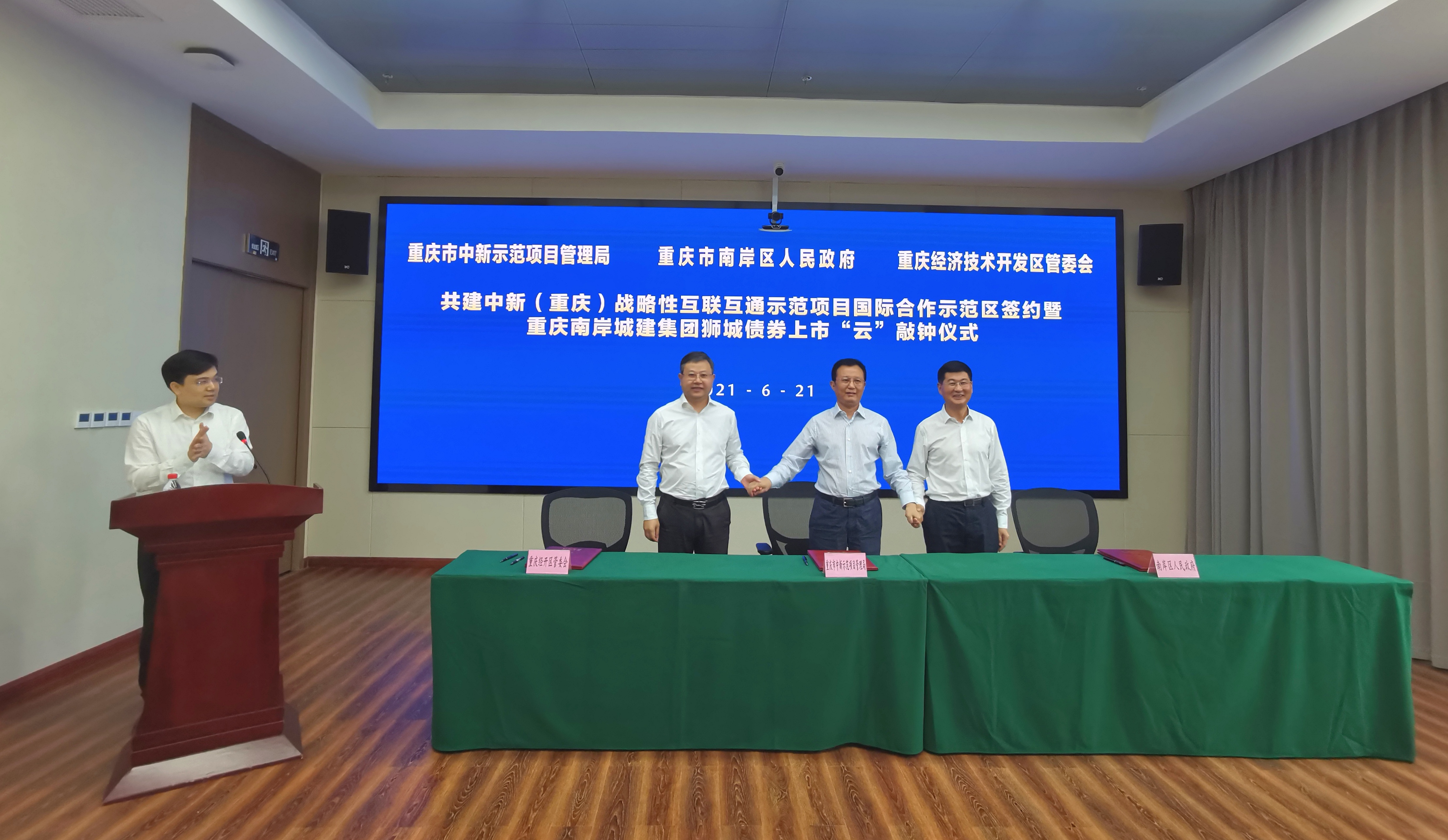 21日,重慶市中新項目管理局與南岸區、重慶經開區舉行共建中新(重慶)戰略性互聯互通示範項目國際合作示範區簽約儀式暨重慶南岸城建集團獅城債券上市「雲」敲鐘活動,為中新戰略性互聯互通項目「第二個五年」謀新篇、探新路、開新局奠定堅實合作基礎。