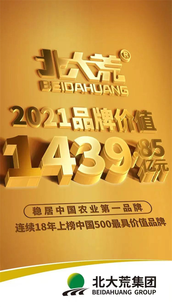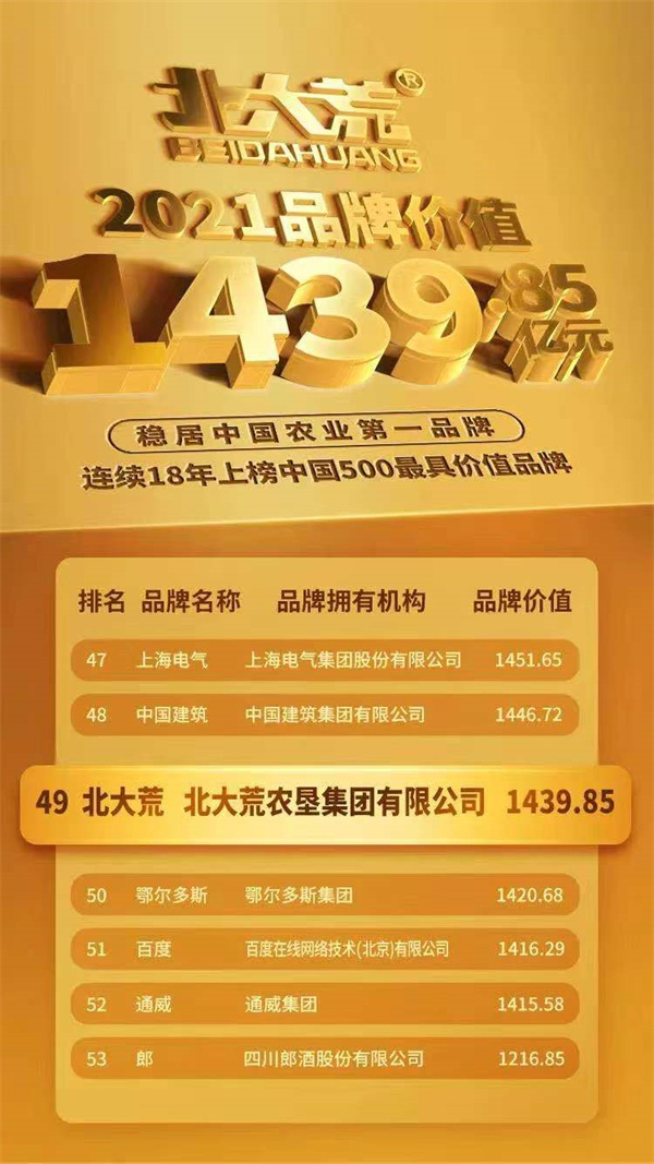 6月22日,由世界品牌實驗室(World Brand Lab)主辦的2021 年(第十八屆)世界品牌大會暨 2021 年(第十八屆)《中國 500 最具價值品牌》發佈會在北京中國大飯店舉行,會上發佈了2021年《中國500最具價值品牌》分析報告。北大荒農墾集團有限公司持有的「北大荒」品牌價值達1439.85億元,榮登《中國500最具價值品牌》排行榜第49位。