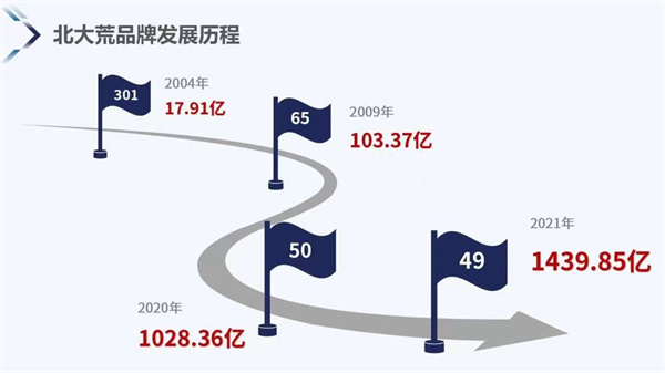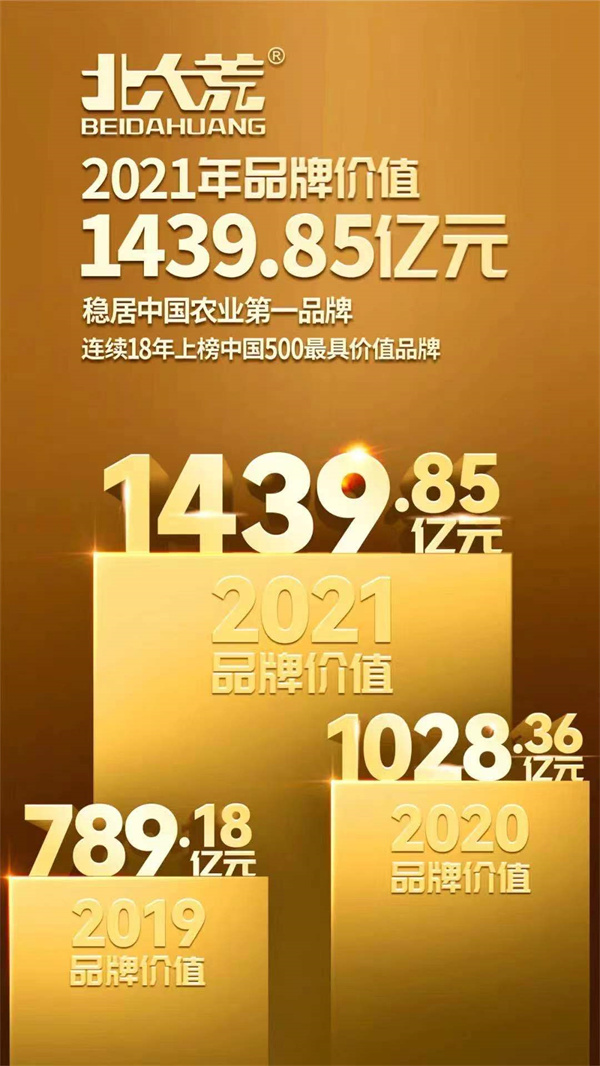 在這份基於財務數據、品牌強度和消費者行為分析的年度報告中,由北大荒農墾集團有限公司持有的「北大荒」品牌,品牌價值達1439.85億元,排名第49位,較2020年1028.36億元增長411.49億元,排名提升1位。同2004年品牌價值17.91億元相比,17年間「北大荒」品牌價值增長了80倍。