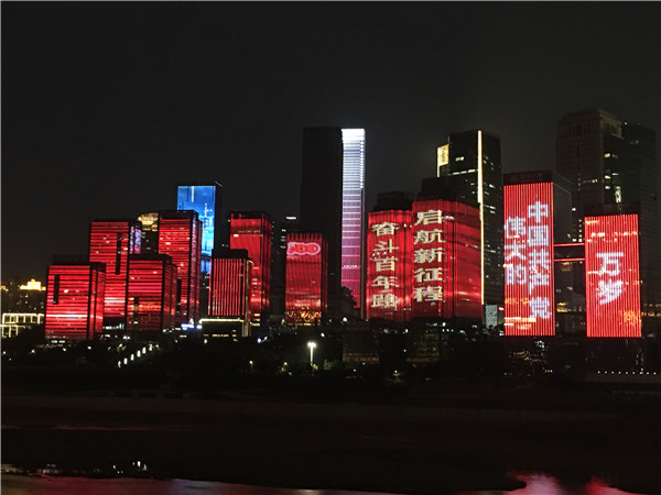 22日晚,江水山城重慶展現大型主題燈光秀,重慶大劇院、江北嘴、解放碑等主要地標性建築,慶祝中國共產黨建黨100週年的主題標語不停閃爍,照亮夜空,呈現江面,精彩紛呈。