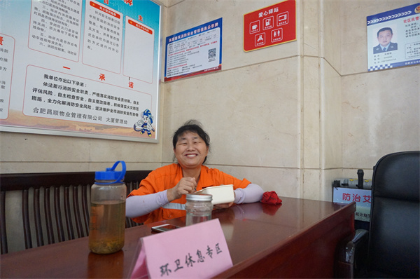 臨近中午,安徽合肥驕陽似火。蜀山區城管局環衛工人谷天菊和同事一起,走進位於南一環路的蜀山區政府辦公樓,在向值班門衛打招呼後,來到一樓大廳的「環衛工人休息專區」。她從小冰箱裏取出自己早上從家帶來的飯菜,放進一旁的微波爐里加熱。2分鐘後,一份熱氣騰騰的午餐「出爐」了。谷天菊和同事坐在休息專區的桌椅上,吹着電扇,津津有味地吃起了午餐。