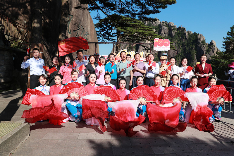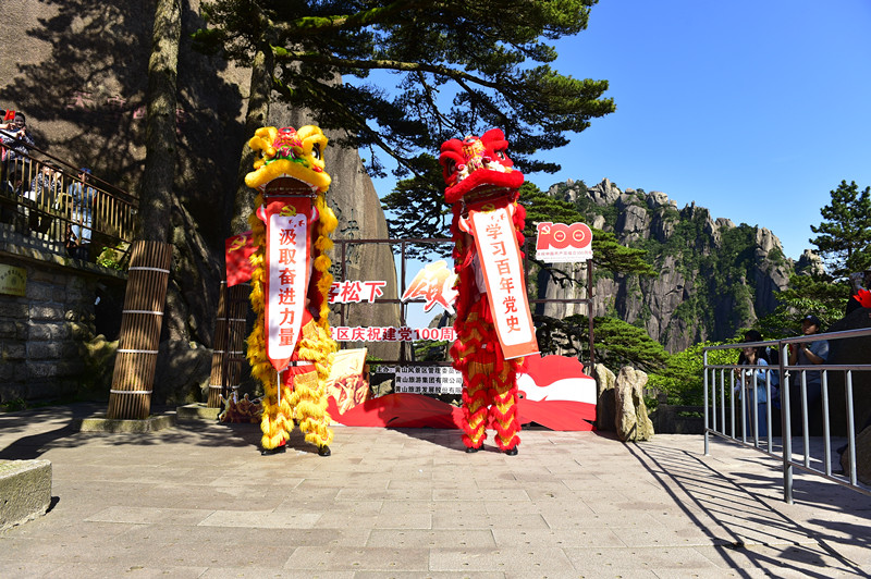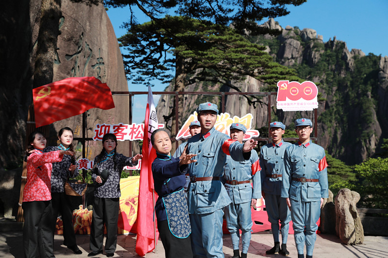 為隆重慶祝中國共產黨成立100周年,傳承紅色文化,弘揚革命精神,6月22日,黃山風景區“迎客松下頌黨恩”文藝展演活動在海拔1700米的迎客松下舉行。景區黨工委委員、管委會副主任程光華,景區一線幹部員工和來山遊客共數百人觀看展演。