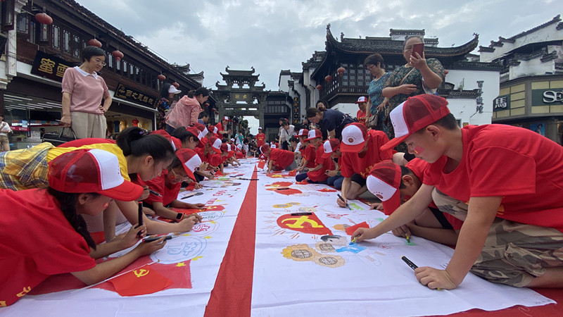 為了慶祝中國共產黨建黨100周年,6月19日,安徽黃山市屯溪區老街辦與黃山市徽美書畫院聯合舉辦“百名師生繪百米長卷獻禮建黨百年”活動,展示中國共產黨百年來波瀾壯闊的奮鬥歷程及取得的輝煌成就。