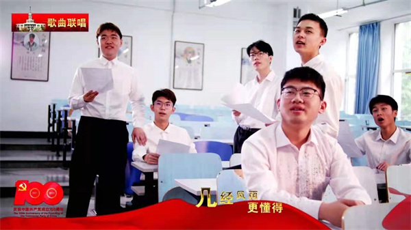 歌曲《沒有共產黨就沒有新中國》師生用歌聲訴說着對黨的赤子之情。歌曲《在燦爛的陽光下》歌頌了中國共產黨「百年征程波瀾壯闊,百年初心歷久彌新」。
