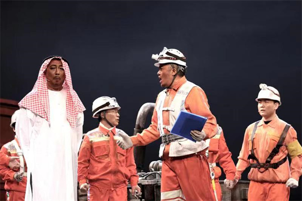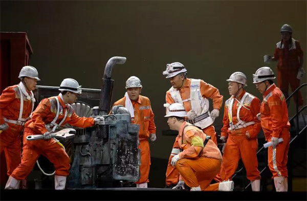 舞台上,上世紀60年代「荒原一片篝火紅」的油田會戰工地、王啟民潛心科研的油田試驗區,還有李新民率領的1205鑽井隊遠在蘇丹的打井作業現場,隨着三個場景的不斷變換,三代鐵人交替登場、隔空對話、激情碰撞,一幕幕動人的畫卷、一曲曲英雄的讚歌,讓觀眾深深感動和震撼。
