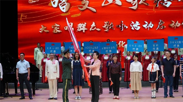 5月25日,新疆「唱支山歌給黨聽」大家唱群眾歌詠活動啟動儀式上,自治區文化和旅遊廳黨組書記、自治區文博院黨組書記侯漢敏為活動授旗