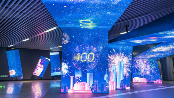 建黨百年之際,為了在地鐵空間營造起慶祝中國共產黨成立100周年的火熱氛圍,地鐵4號線溁灣鎮站的地鐵數字藝術館推出了絢爛奪目的地鐵「數字煙花秀」,「100」字樣的煙花通過數字藝術的形式在夜空中繽紛綻放,天心閣、嶽麓書院等長沙地標沿着乘客動線轉換移動,吸引不少乘客紛紛駐足打卡。
