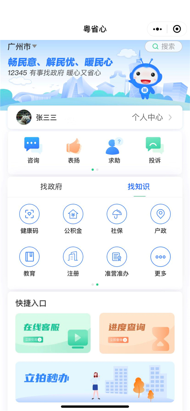 「多功能一站集成」也是「粵省心」的一大亮點。為完善各地政務信息查詢,「粵省心」推出的全省知識庫,涉及公積金、消費維權、疫情防控、健康碼、出入境、企業註冊、准營准辦等31類政策資訊,涵蓋全省21個地市高頻訴求事項。