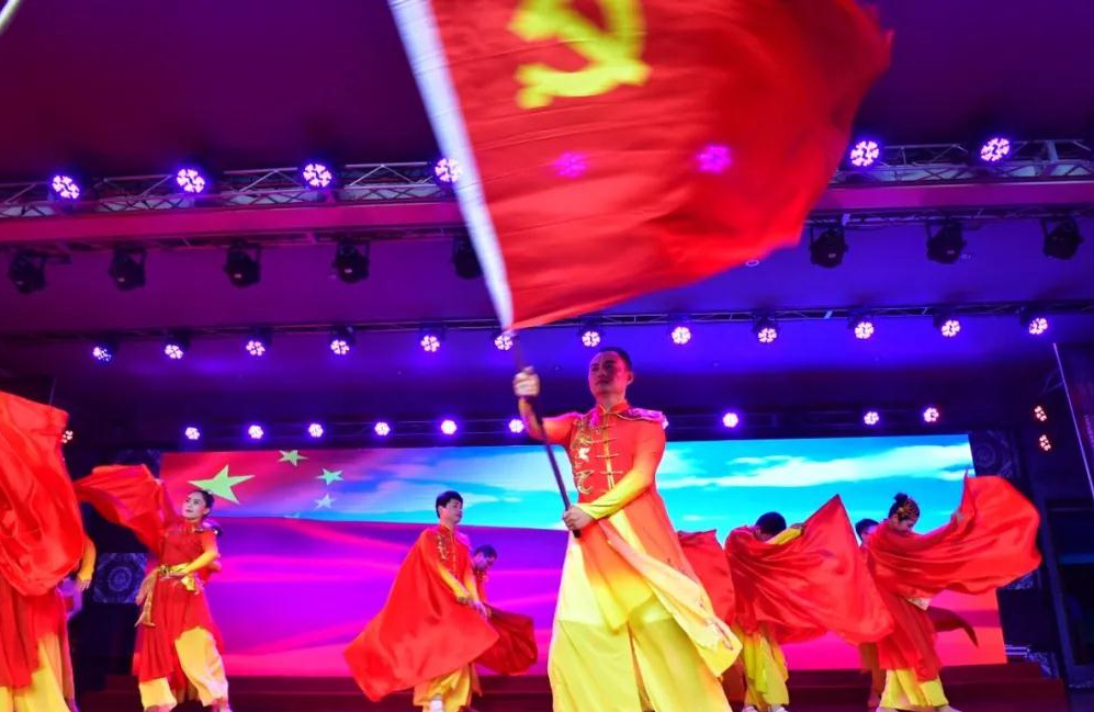 整場文藝演出分為開天闢地、艱苦奮鬥、繼往開來、築夢盛世等共4個章節。開場節目舞蹈《紅旗頌》氣勢恢宏,活躍了現場氣氛;演出在詩歌朗誦《紅船,從南湖啟航》中拉開了序幕,歌曲《共產黨頌》、大合唱《走向復興》、笛子獨奏《好日子》等一個個精彩節目陸續上演,為現場觀眾帶來一場視聽盛宴。在眾多節目中,小品《水果攤進店》、話劇《交班》尤為受到觀眾青睞,更是將整場晚會引向了高潮,贏得台下觀眾陣陣掌聲。