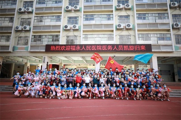 7月6日上午9點,寶安區福永人民醫院福圍專班醫護人員凱旋儀式在福圍社區下十圍小學舉行。