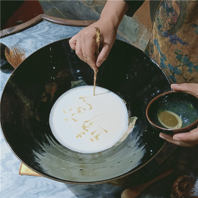 “點茶貴黑盞”,靖窯的“黑”,在一場宋式點茶雅集中,讓我們遇見了不一般的“白”。插花掛畫,燒香點茶,茶粉與水的撞擊中,乳霧洶湧,手停下時,那乳白的茶湯與靖窯黑盞的極致對比,盡顯優雅。乳白的泡沫在杯中經久不散,品入口中,感受細膩的泡沫在舌尖上一個個散破。淡苦的回甘中,循著時空,宋朝文人雅士的四般閒事,書、花、香、茶,宋式美學魅力在眼前鋪展。