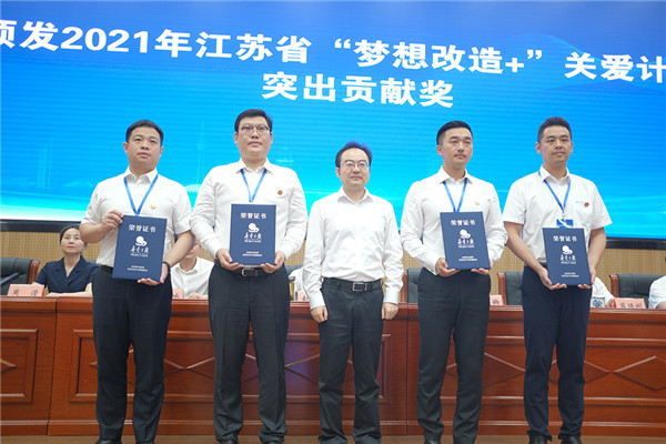 共青團江蘇省委副書記潘文卿為獲得2021年江蘇省「夢想改造+」關愛計劃突出貢獻獎的南通市青年商會會員企業頒發證書
