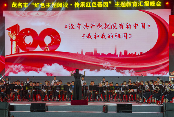 以慶祝建黨100周年,紅色文化進校園為主題,7月12日,由中共茂名市委宣傳部指導,茂名市委教育工委、茂名市教育局主辦,茂名市廣播電視台承辦的茂名市「紅色主題閱讀?傳承紅色基因」主題教育活動匯報晚會在茂名文化廣場上演,近千名師生觀看了演出。