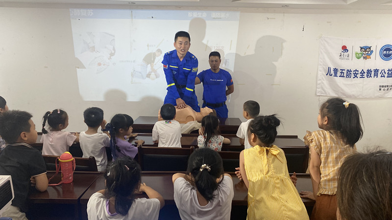 在安全教育小課堂上,“藍天救援隊”的專業救援人員,正針對屯溪區各地水域較多的情況,把當地城市和鄉村裏,不同環境中易發生的兒童溺水事故,特別是為了營救溺水同伴而發生的多人溺水事件,通過現場課的形式分析案例,體驗式的普及兒童以及家長的防溺水安全常識,讓他們遠離溺水危險。