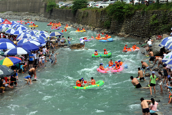 漂流河道位於清澈見底的白沙河,河兩岸竹木蓊鬱,連綿山峰相峙,堪稱「成都小三峽」。炎炎夏日,和家人朋友乘坐橡皮艇順流而下,奔騰咆哮的河水托起橡皮艇,飄蕩着在險峻的峽谷中穿梭,時而急流,時而險灘,讓浪花盡情扑打身體,洗掉煩惱,漂走疲憊。在水花飛濺、驚聲尖叫中感受夏日的爽快,還有突然而至的沿岸「伏兵」水槍衝擊,處處都是水上「戰場」,歡笑聲在山間迴蕩,趣味十足。