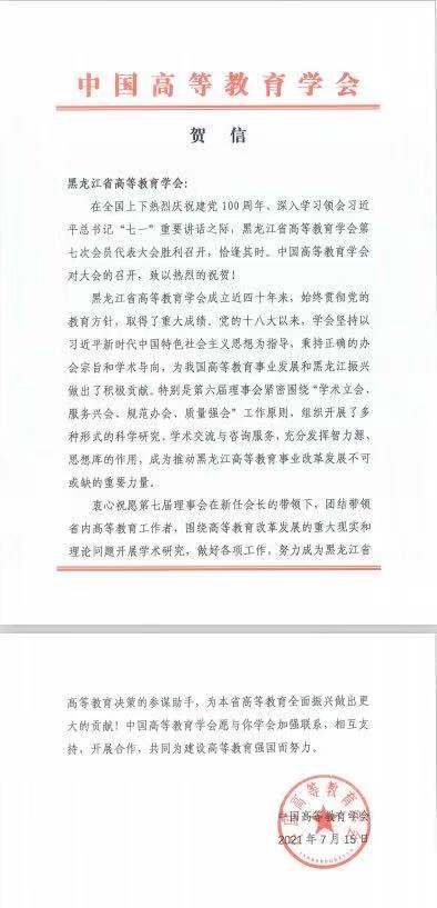 7月15日,黑龍江省高等教育學會第七屆會員代表大會在哈爾濱師範大學召開。省教育廳黨組書記、廳長趙國剛,省社科聯黨組書記、副主席劉德權,省教育廳原黨組書記、廳長,黑龍江高等教育學會第六屆理事會會長張永洲,省教育廳原黨組書記、廳長,黑龍江高等教育學會第六屆理事會副會長徐梅,第七屆理事會秘書處單位、哈爾濱師範大學校長孫立軍,黑龍江教師發展學院黨委書記吳濤,東北農業大學原黨委書記孫登林,省教育廳二級巡視員丁哲學,黑龍江大學黨委書記王永清,哈爾濱醫科大學副校長方傳龍,哈爾濱工程大學副校長吳林志,哈爾濱商業大學校長鄭秋鶥,哈爾濱理工大學黨委書記、校長趙琳,東北石油大學校長蔣明虎,齊齊哈爾大學黨委書記陳桂芝,黑龍江省高等教育學會第六屆理事會秘書長李宏志等領導出席大會,會議由省教育廳原黨組副書記、副廳長,黑龍江省高等教育學會常務副會長魏兆勝主持。