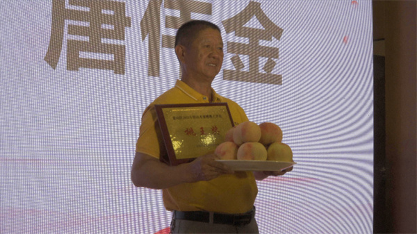 陽山水蜜桃桃王評選會頒獎現場,唐偉金手捧「桃王」。(張旭 攝)