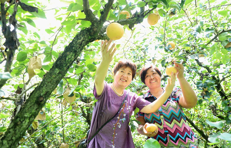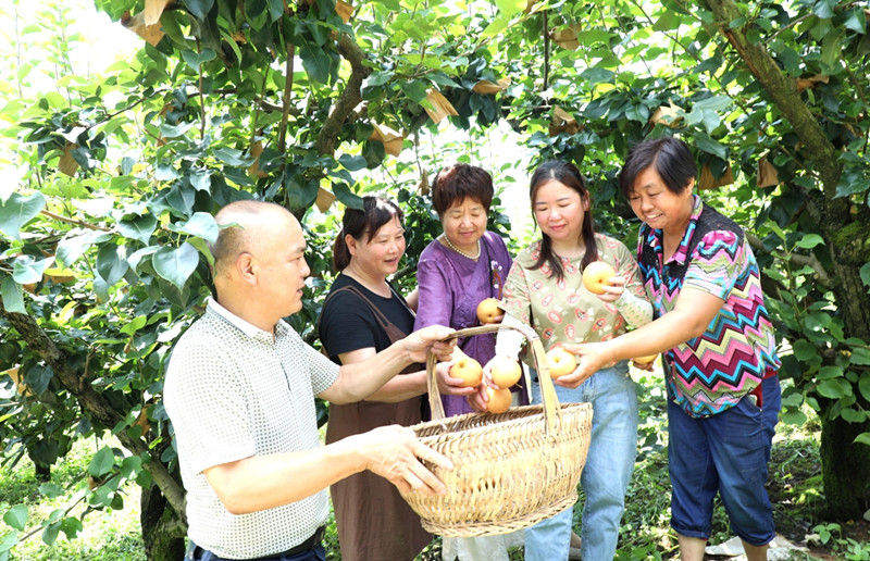 7月16日,安徽歙縣許村鎮塔山村宏林華家庭農場徽州雪梨喜獲豐收,遊客慕名驅車到果樹下,幫助農場主李昌林(右)採摘雪梨。