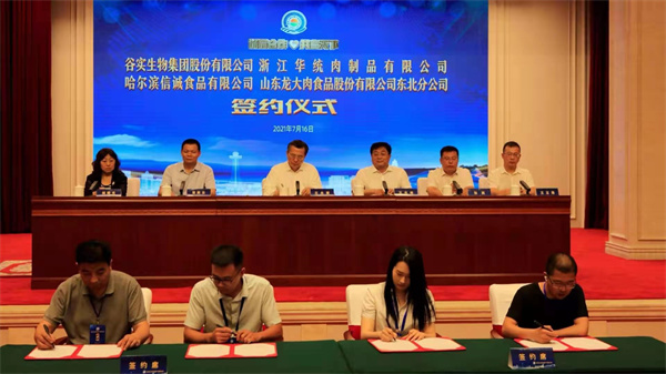 會上,省民政廳二級巡視員楊曉光宣讀了黑龍江省生豬產業聯合會批准文件;舉行了國家級生豬屠宰標準化示範企業授牌儀式;浙江省肉類協會、山東省生豬產業聯合會與黑龍江省生豬產業聯合會簽署了肉類產品產銷對接合作框架協議;海康威視集團、中國建設銀行黑龍江省分行、哈爾濱農村商業銀行與黑龍江省生豬產業聯合會簽訂了技術、金融支持合作框架協議;省外屠宰企業與省內屠宰企業簽署商務合作協議。