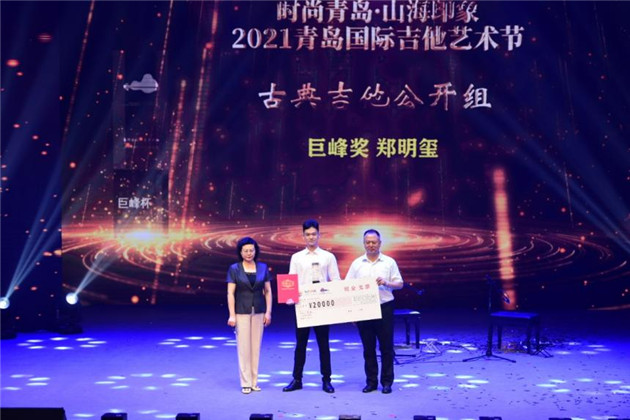 青島市文聯黨組成員、副主席徐健,青島市文化和旅遊局副巡視員郝紅共同為古典吉他公開賽冠軍獲得者鄭明璽頒發「巨峰獎」。