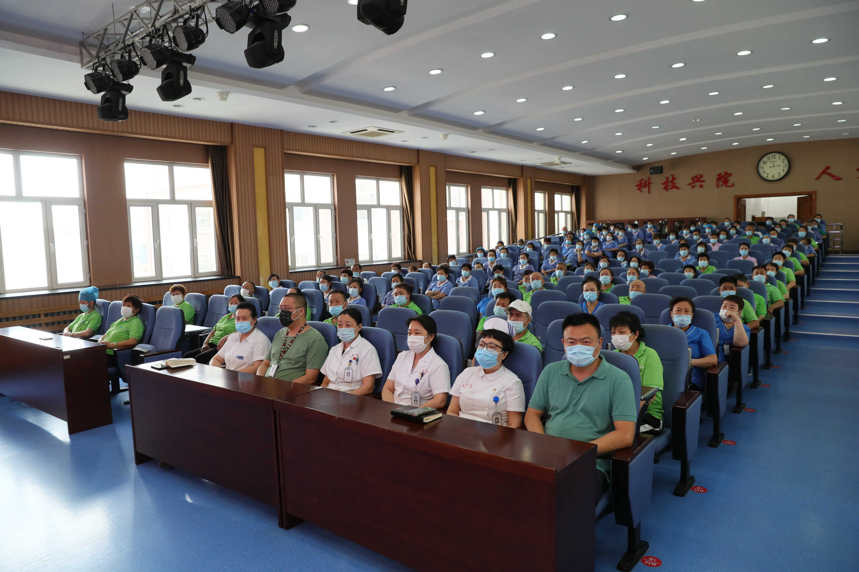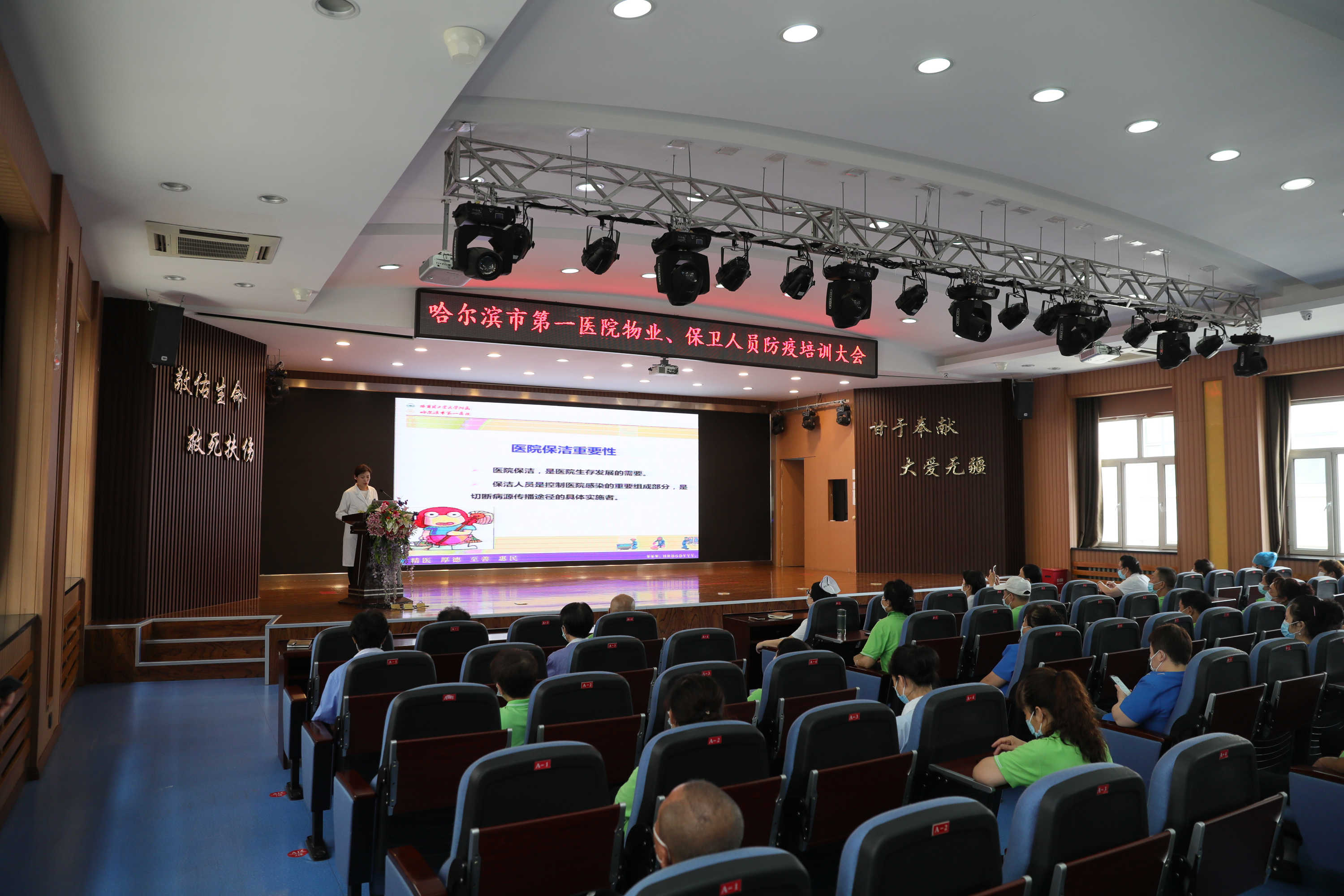 7月22日,哈爾濱市第一醫院為加強醫院新冠肺炎疫情防控能力,提高保潔、保衛人員對新型冠肺炎疫情防控知識的認識,規範工作流程,針對保潔員、護理員、保衛人員開展了疫情期間規範化管理工作流程、要求和「四防」安全培訓。副院長吳麗潔、感染科科長王麗萍、護理部主任李艷奇、保衛科科長李建浩等參會,會議由總務科科長于波洋主持。