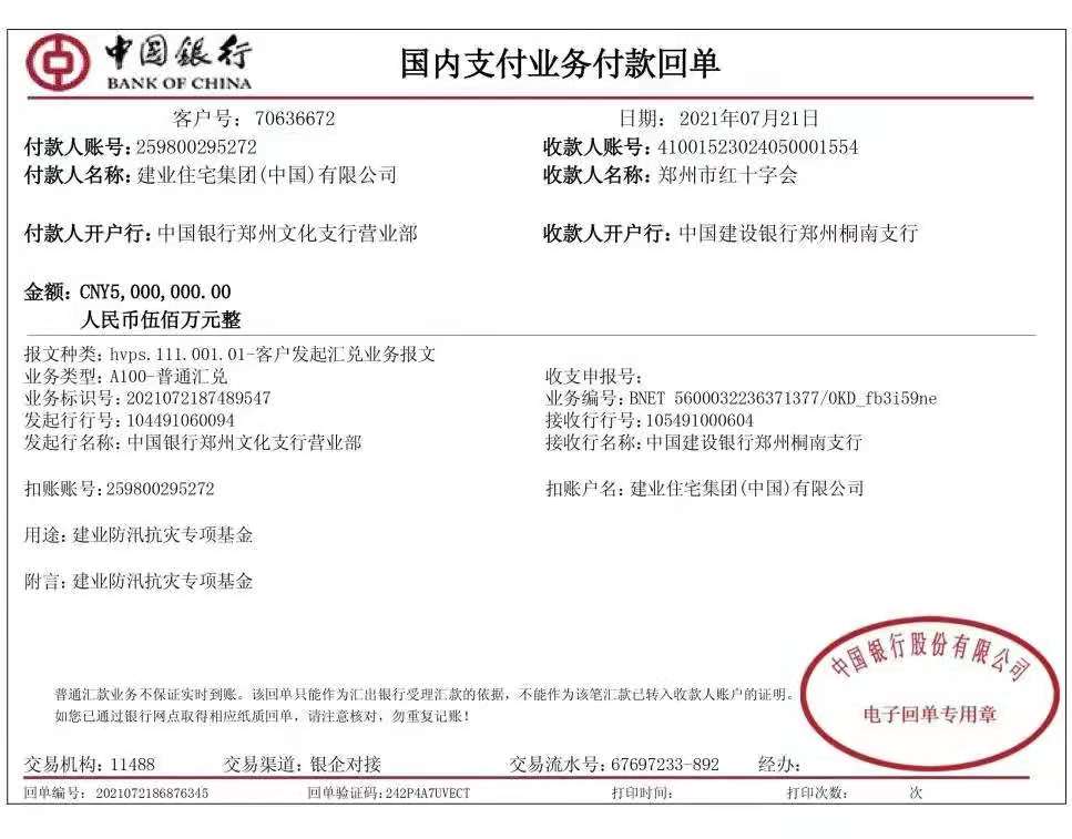 暴雨來襲,鄭州挺住!河南加油!7月21日,建業集團向鄭州市紅十字會捐贈現金500萬元,設立「建業防汛抗災專項基金」。