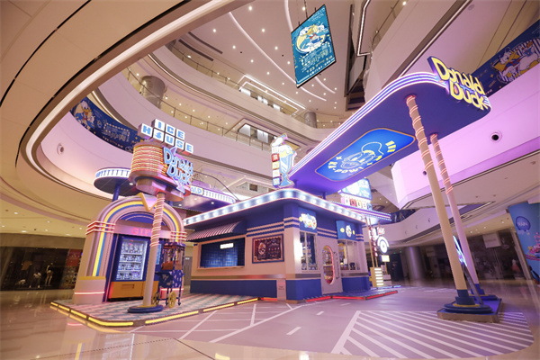 刨冰主題展內則呈現出不同的色彩衝擊。藍黃色的格紋撞色搭配,與霓虹燈圖案鮮明呼應,極具年代感的牆面、地磚等細節滿滿的醒目視覺設計,傳遞出新潮藝術風格。店內極具主題個性的冰櫃主題陳列櫃內,獨一無二的唐老鴨主題麵粉袋、鋁罐、汽水罐等主題擺件皆在其中,成為網紅達人必打卡的潮流熱點,獨家定製風格與創意藝術的融合,為市民帶來全新的體驗氛圍。