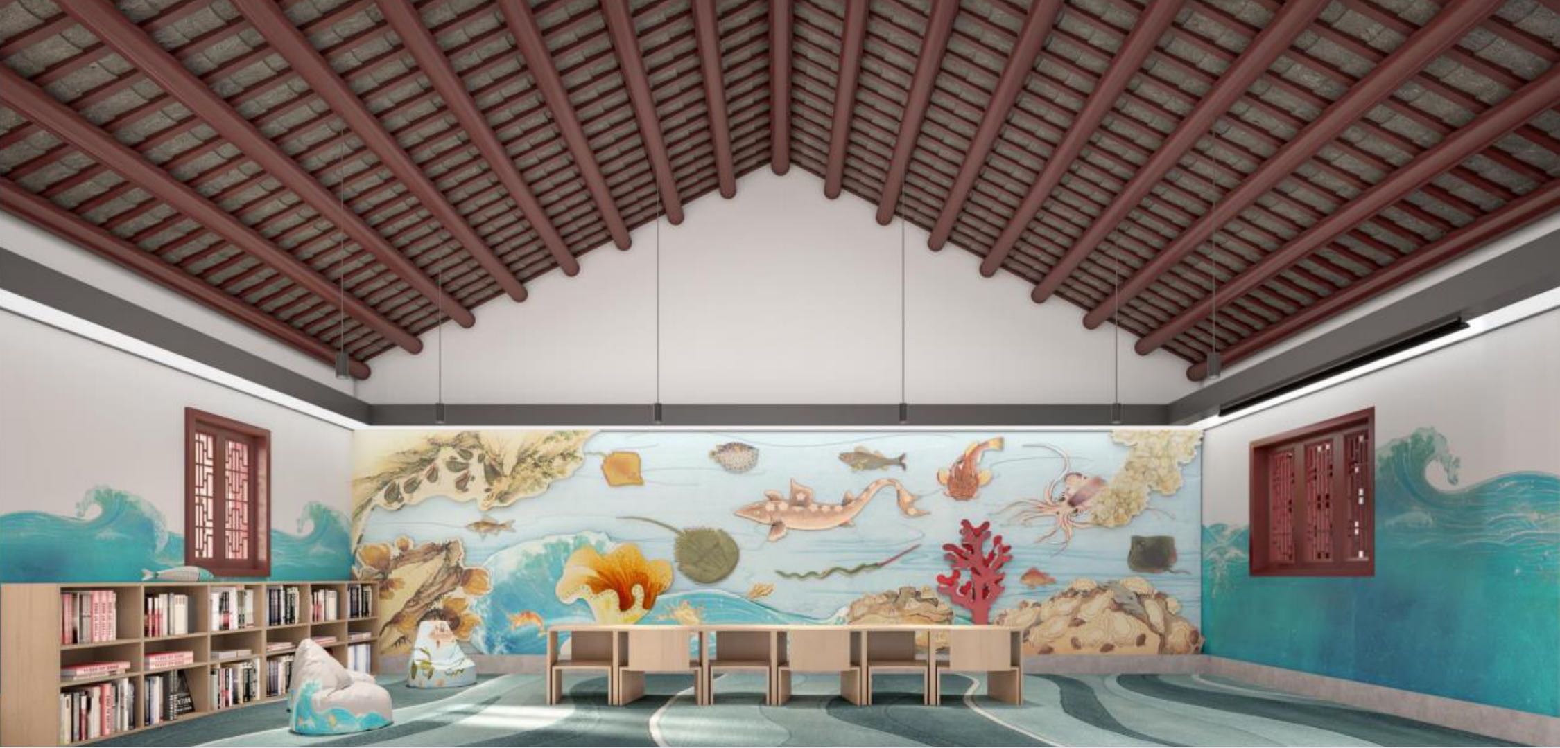 記者注意到,童書館整體設計以大鵬新區幽遠浩渺的海灣和蒼翠蓊鬱的山林為靈感,劃分為「海洋」「森林」「陸地」三大主題空間。結合大鵬古城的古建築特色,以藍、綠、黃三色對應三大空間,大幅使用天然木紋,空間視覺更加自然柔和、和諧統一。歷史是一幅畫,時間是畫紙,古今閱讀空間的激情碰撞躍然紙上,賦予童書館更深厚的文化內涵。