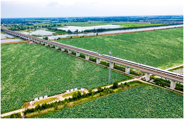 一列高鐵從曹老集鎮東海島生態園呼嘯駛過