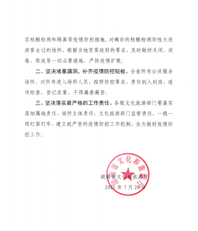 7月27日,湖南省文化和旅遊廳曾下發《關於做好當前文化和旅遊行業新冠肺炎疫情防控工作的通知》,明確要求各地強化對重點文化和旅遊場所管理,切實加強疫情防控工作的督導檢查,督查其是否真正落實相關防控措施、是否有疫情防控應急預案、是否做好新冠病毒疫苗接種等工作,及時消除風險隱患。要嚴格控制大型活動的審批,儘量減少各類非必要的聚集性活動。