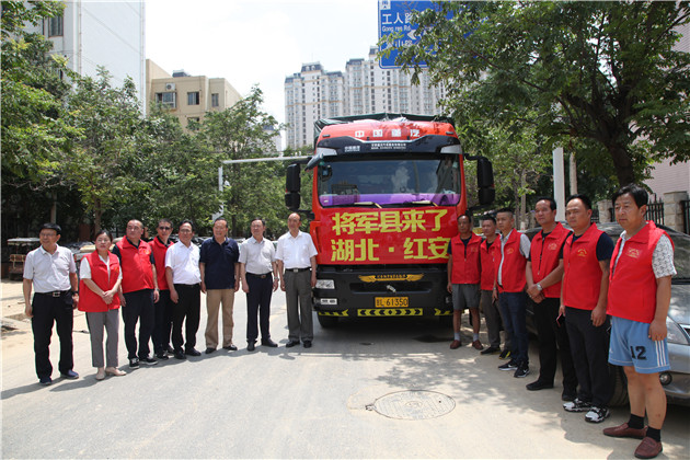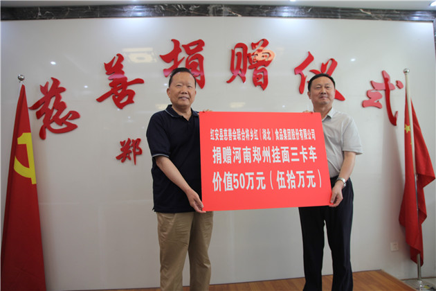 7月27日凌晨五時許,在紅安縣政協主席徐鼎榮的帶領下,紅安縣民政局、縣慈善會、將鄉紅(湖北)食品集團股份有限公司等主要負責人從紅安出發,將價值50萬元的優質麵條送到河南鄭州災區人民的手中,也送達老區人民的一片深情。
