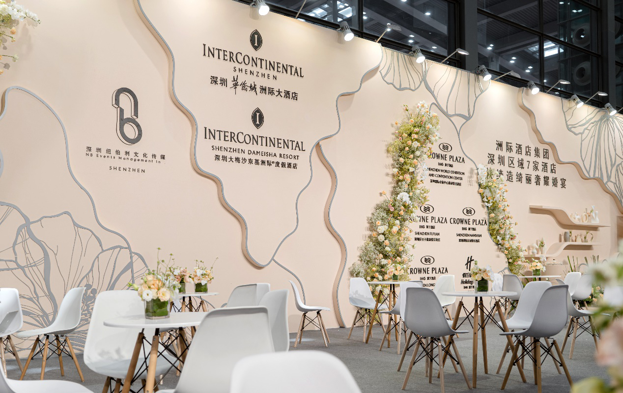 婚博會現場以「繁花之境」為靈感,現場採用米白色為主色調渲染純潔愛意,通透的空間,流動的線條,精緻繁花於光影間繾綣交織成一幅生動唯美的浪漫景象,向新人傳遞經典的永恆之愛,彰顯洲際酒店集團旗下品牌奢華且前衛的婚典主張。