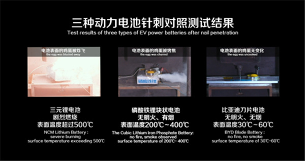 針刺測試的結果對比明顯,比亞迪刀片電池針刺後,無明火、無煙,表面溫度僅為30-60℃。普通磷酸鐵鋰電池針刺後,無明火,冒煙,表面溫度200℃-400℃。三元鋰電池針刺後,劇烈燃燒,表面溫度超過500℃。