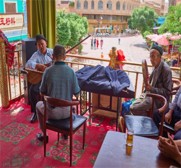 百年老茶館的門廊,幾位維吾爾族老人彈奏着熱瓦普,哼唱着《十二木卡姆》