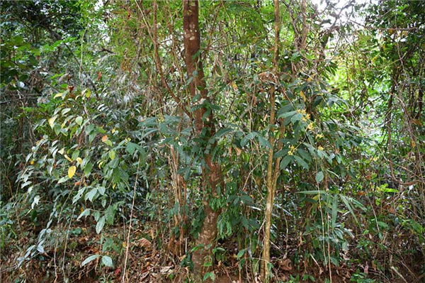 盈江斑果藤,屬藤本植物,爬附於其他樹之上。(申健勇攝)